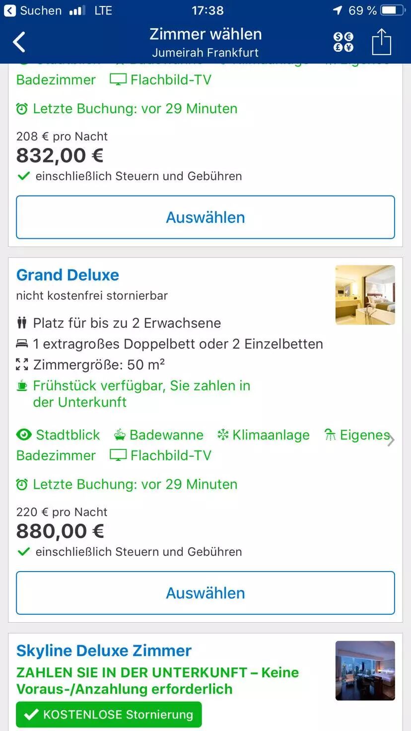 我给大家举个例子:如果计划做的够早,酒店标准间在法兰克福80欧可以订到凯悦,200欧可以订到朱美拉全景套房。