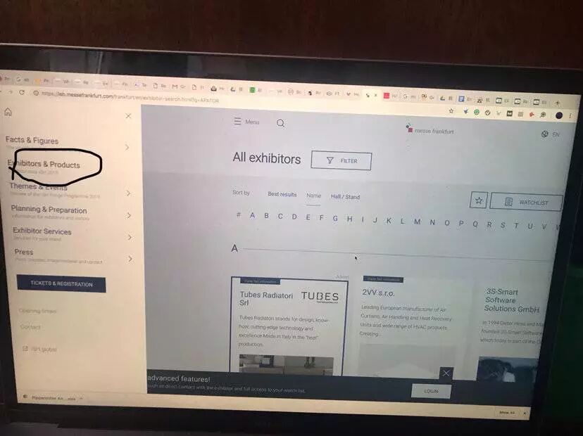 但其实这也不是 trick,一般来说德国的大型展会都很国际化,都会有清楚的英语表示,会清楚的告诉你那里找到 exhibition list 并且分类然后告诉你给公司留言的方法。